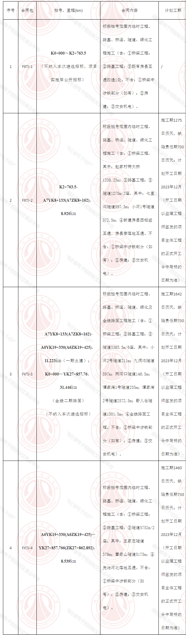FXTJ-2标段第一中标候选人:中铁十一局集团有限公司,计划工期1275日历天,计划开工日期2023年12月01日。合同估算价12.91亿元;FXTJ-4标段第一中标候选人:中铁十一局集团有限公司,计划工期1460日历天,计划开工日期2023年12月01日,合同估算价12.5亿元。(此文出自见道官网:www.seetao.com未经允许不得转载否则必究,转载请注明见道网+原文链接)见道网工程栏目编辑/赵娥