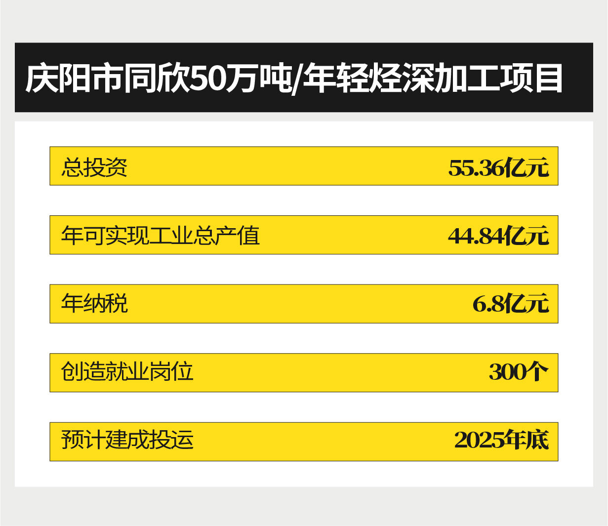 庆阳市同欣50万吨/年轻烃深加工项目总投资55.36亿元,计划建设液化气分离等装置及配套设施,生产丙烯等8种产品,预计2025年底建成投运。项目投产后,年可实现工业总产值44.84亿元,年纳税6.8亿元,创造就业岗位300个。该项目由庆阳市与长庆油田分公司议定,与西安长庆同欣石油科技公司在庆阳市合资注册成立庆阳同欣石油科技股份有限公司,利用长庆油田副产轻烃、液化气等资源,在西峰工业园区建设年产50万吨轻烃深加工项目,打造现代化百亿级化工企业和百万吨级新材料基地。