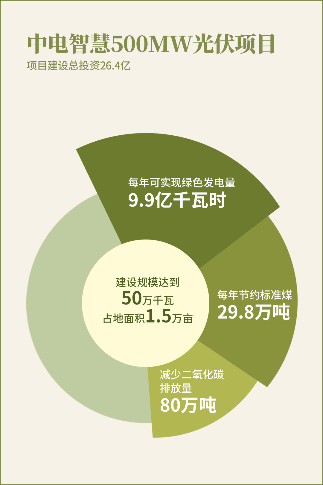 中电智慧喀什地区麦盖提县50万千瓦光伏项目的实施是国家实现碳达峰、碳中和战略的重要措施,同时也将推动麦盖提县推进光伏治沙新模式的绿色示范。该项目的建设规模达到50万千瓦,占地面积1.5万亩,建成后每年可实现绿色发电量9.9亿千瓦时,节约标准煤29.8万吨,减少二氧化碳排放量达80万吨。这一项目的实施将对麦盖提县的产业结构调整和新的经济增长极的培育产生强大的推动和带动效应。