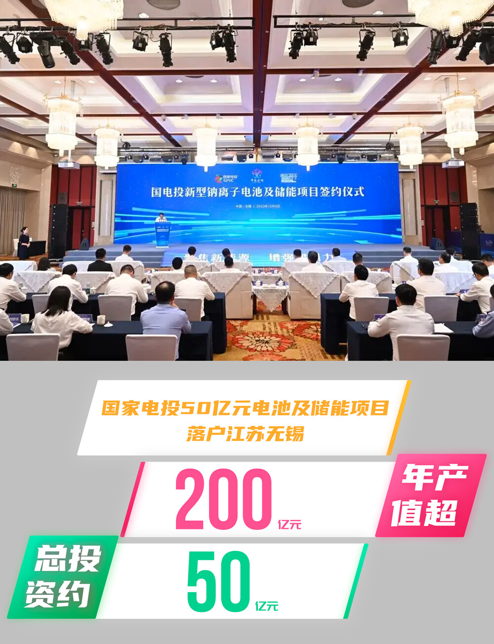 2023年10月9日,无锡经开区与国家电投集团签署了新型钠离子电池及储能项目投资协议,项目总投资为50亿元。