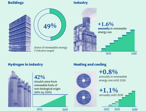 整体的一揽子计划包括广泛的减排目标、增加自然碳汇的目标以及更新的排放交易体系,这些目标都是为了限制排放、对污染进行定价、为绿色转型吸引投资以及为公民和小企业提供社会支持。根据新的可再生能源指令,欧盟将在2030年前将可再生能源在整体能源消耗中的比例从之前的32%大幅提升至42.5%,并额外增加2.5%的指示性补充,以实现45%的目标。每个成员国都将为这一共同目标做出贡献。
