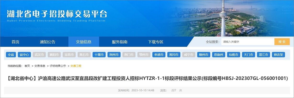 2023年10月10日,湖北省电子招投标交易平台发布了沪渝高速公路武汉至宜昌段改扩建工程投资人招标HYTZR-1-1标段评标结果公示,当地强企拿下大单,投标报价417亿元。