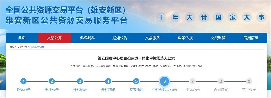 2023年10月13日,河北省招标投标公共服务平台发布了雄安国贸中心项目投建运一体化中标候选人公示,该项目建设地点位于河北雄安新区,项目总投资约为125.69亿元。