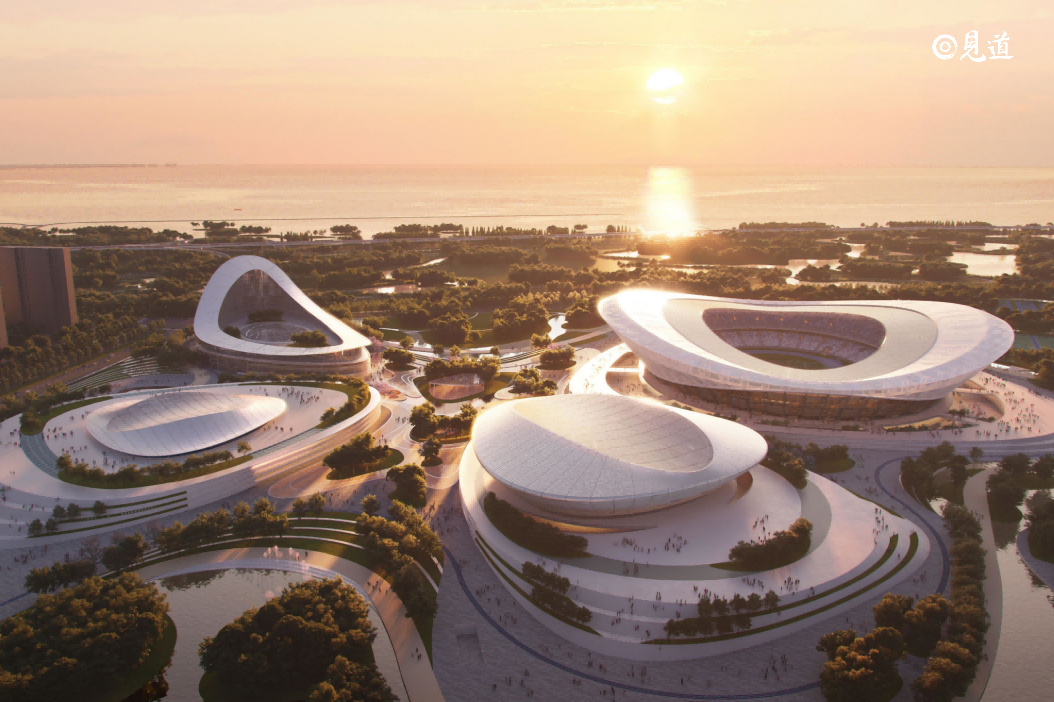 该项目的设计理念是“迎客扇风,明珠耀九洲”,各场馆的布局都以海为背景,宛如一颗颗璀璨的明珠,熠熠生辉。综合体育场位于场地东南角,拥有开阔的视野和优越的地理位置。其设计灵感源自中国的传统礼扇,屋顶呈现叠瓦的形态,立面则融合了南粤帆船的设计意象,展示了岭南传统建筑空间的绚丽景观。看台采用不对称布置及立面开口设计,使得大部分观众都能欣赏到海景,形成以天为幕、以海为席的壮丽画面。