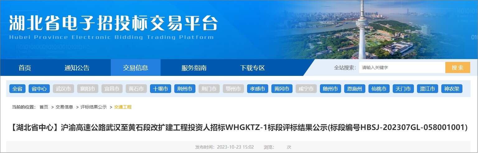 2023年10月23日,见道网记者从湖北省电子招投标交易平台获悉,沪渝高速公路武汉至黄石段改扩建工程投资人招标WHGKTZ-1标段评标结果公示已发布,央企和地方企业联合斩获大单。