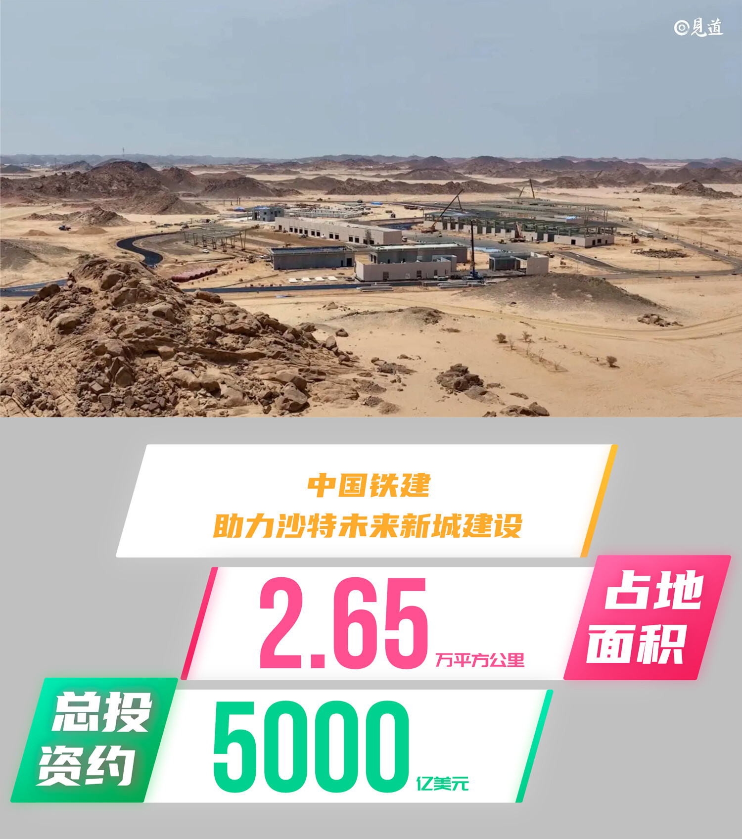 未来新城位于沙特西北部塔布克省,是现今在建的最大工程之一,总投资达5000亿美元,占地面积2.65万平方公里,包括一线城、清洁工业和创新城、生态旅游城等多个区域,将完全依靠可再生能源供能。其中,大开挖工程每周挖掘量达200万立方米,单是一线城项目已使用的混凝土数量已是上海东方明珠的五倍,所用钢材为埃菲尔铁塔钢材料的六倍。