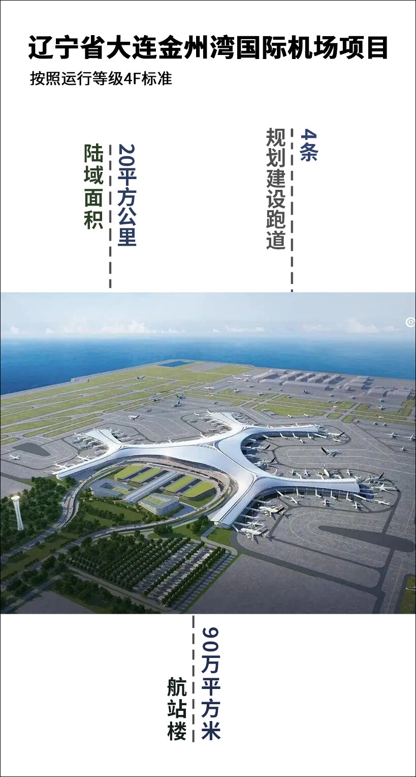 该项目是国家“十四五”规划102项重大建设项目、辽宁省统筹发展和安全重大工程之一,是国内首个离岸式“人工岛”机场,陆域面积20平方公里。按照运行等级4F标准,规划建设4条跑道、90万平方米航站楼。