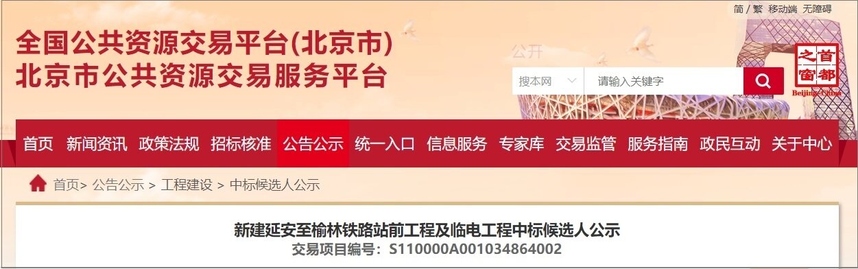 近日,北京市公共资源交易服务平台发布了新建延安至榆林铁路站前工程及临电工程中标候选人公示。延安至榆林高铁将于12月份正式开工,计划工期5年。