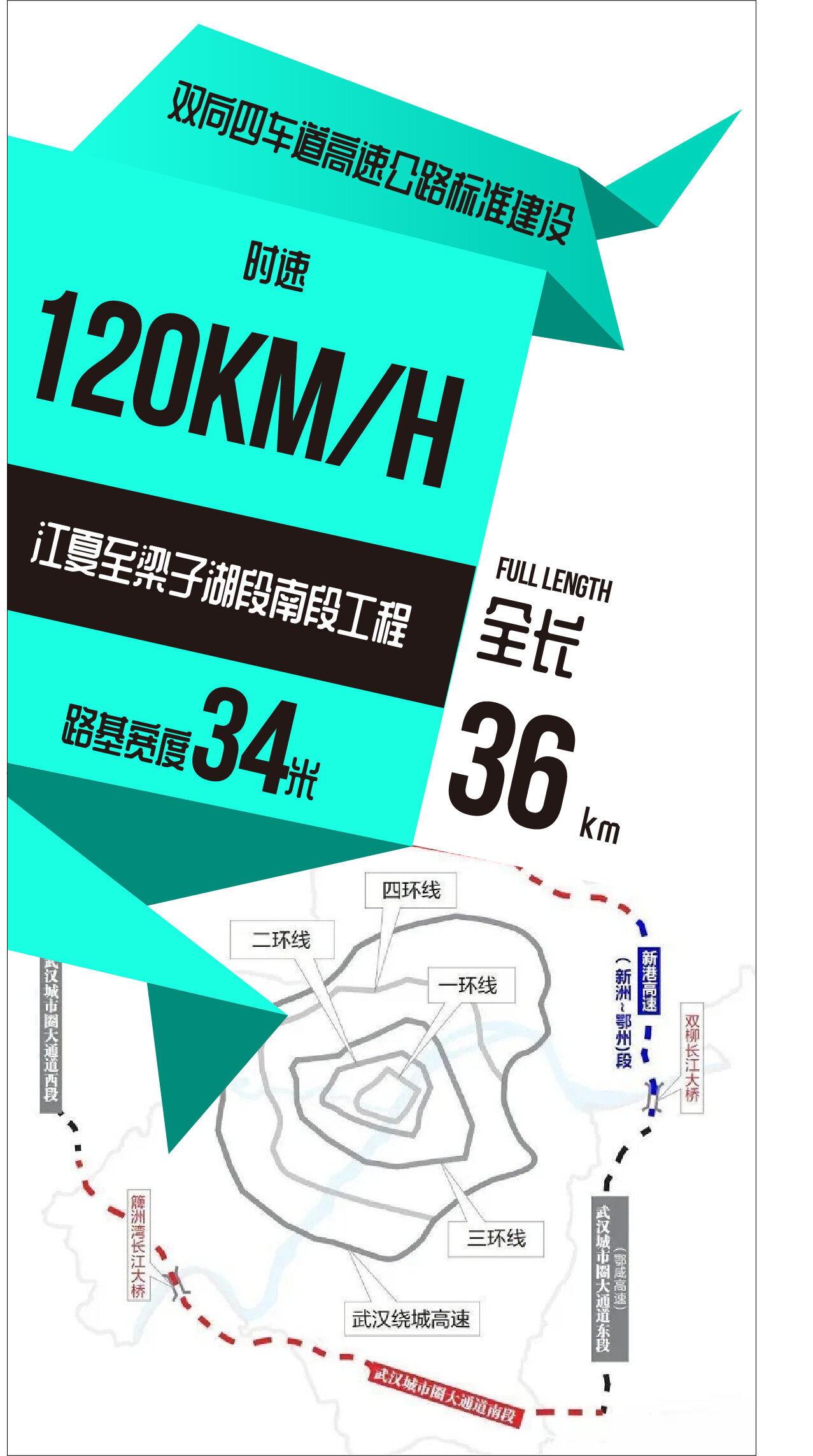 武汉都市区环线江夏至梁子湖段南段工程,全线采用双向六车道高速公路标准,路基宽34m,设计速度采用120km/h,设置互通式立交5处,服务区1处,涵洞53道,通道16道,天桥23座,养护工区1处,监控分中心1处,匝道收费站4处,无特殊结构桥梁。路线起于江夏区山坡街道许家桥南侧,与武汉都市区环线汉南长江大桥及接线工程顺接,止于鄂州市梁子湖区太和镇以南设置太和南枢纽互通与鄂咸高速公路对接,路线全长约36km。关键词:工程施工、工程建设资讯、工程新闻