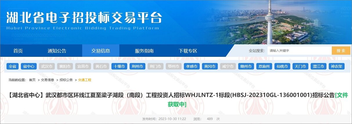 2023年10月30日,湖北省电子招投标交易平台发布了武汉都市区环线江夏至梁子湖段南段工程投资人招标WHJLNTZ-1标段招标公告,该项目所属行业公路,项目总投资估算约84亿元。