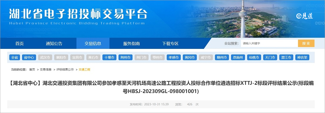 2023年10月31日,湖北省电子招投标交易平台发布了湖北交通投资集团有限公司参加孝感至天河机场高速公路工程投资人投标合作单位遴选招标评标结果公示,具体情况如下: