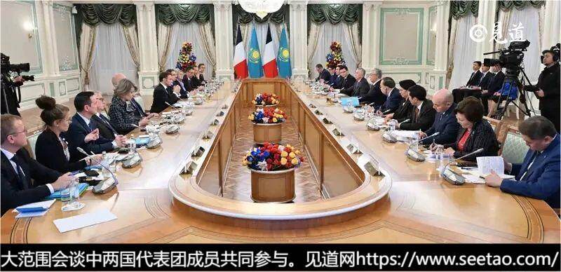 在大范围会谈中,两国代表团成员共同参与,托卡耶夫表示:马克龙的此次访问将双边关系提升到了一个全新的、全面的高度。马克龙则指出,2023年是哈萨克斯坦与法国战略伙伴关系协议签署15周年,重申了法国愿意持续深化与哈萨克斯坦在各个领域的合作,以保障双方的利益的立场。会谈中,两国领导人都在地区和全球热点问题上强调了保持稳定关系的重要性,并对此给予了高度关注。