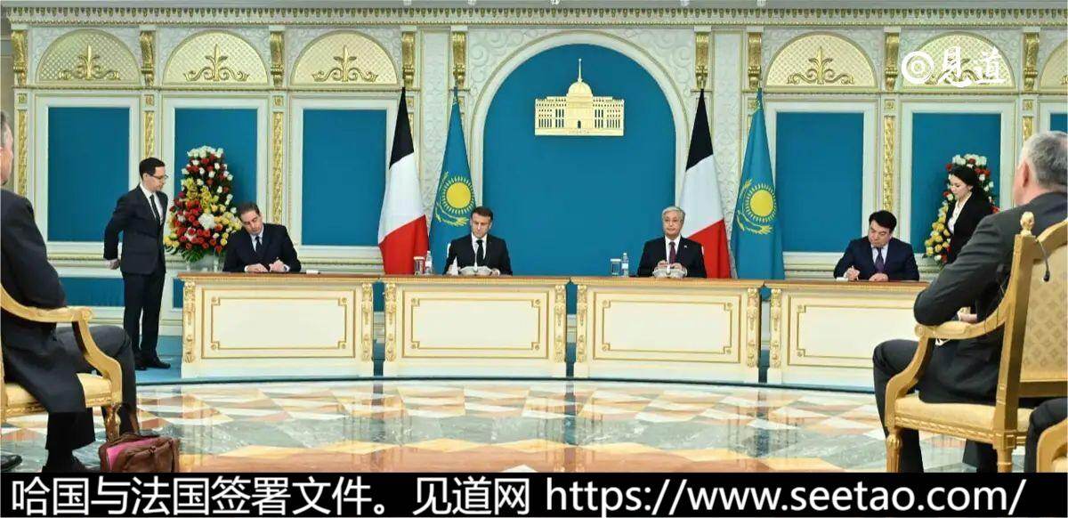 在总统府举行的联合新闻发布会上,经过双边扩大会谈,哈萨克斯坦总统托卡耶夫和法国总统马克龙共同签署关于战略矿产领域合作的声明,托卡耶夫表示,双方在会谈中就加强经贸和投资领域合作,以及推动原料、农业、交通物流、轻工业、医疗卫生、创新、金融和其他行业的新项目实施进行了深入讨论。在当前复杂的国际形势下这具有非常重要的意义。此外,哈方还与勃林格殷格翰、道达尔能源和阿尔斯通公司达成了互利互赢的协议。