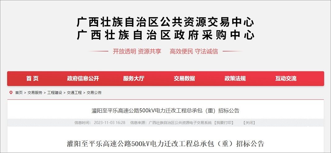 2023年11月3日,广西壮族自治区公共资源交易中心发布了灌阳至平乐高速公路500kV电力迁改工程总承包招标公告,该项目所属行业电力工程,招标人广西新平高速公路有限公司,项目初步设计概算批复136.42亿元。