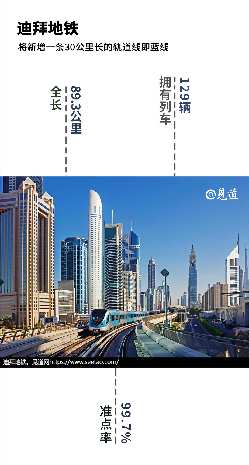 迪拜地铁于2009年9月9日首次开通,是世界上最长的无人驾驶地铁网络。目前,迪拜地铁全长89.3公里,拥有129辆列车,准点率高达99.7%。远景规划显示,到2030年,无人驾驶公共交通的比例将提高到30%,而迪拜地铁正是这一计划的主要体现。红线和绿线目前共有53个车站。最新的延伸项目是2020号线路,从红线的杰贝阿里站延伸到迪拜博览城。这条新线路已于2021年1月1日开始运营。(此文出自见道官网:www.seetao.com未经允许不得转载否则必究,转载请注明见道网+原文链接)见道网战略栏目编辑/许生鹏