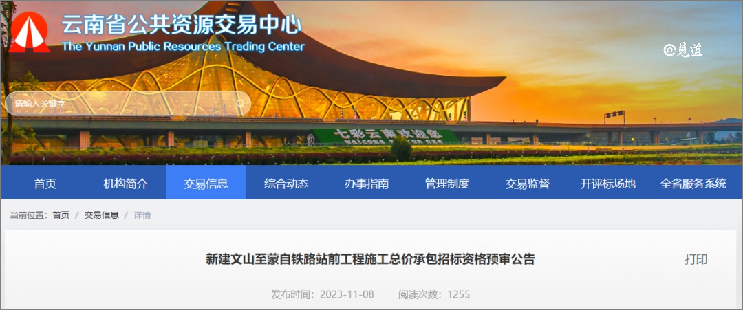 2023年11月8日,新建文山至蒙自铁路站前工程、 四电工程施工总价承包招标资格预审公告及施工监理招标资格预审公告发布。文蒙铁路将于12月底正式开工建设。这也是2023年第4个启动施工招标的国铁干线项目。