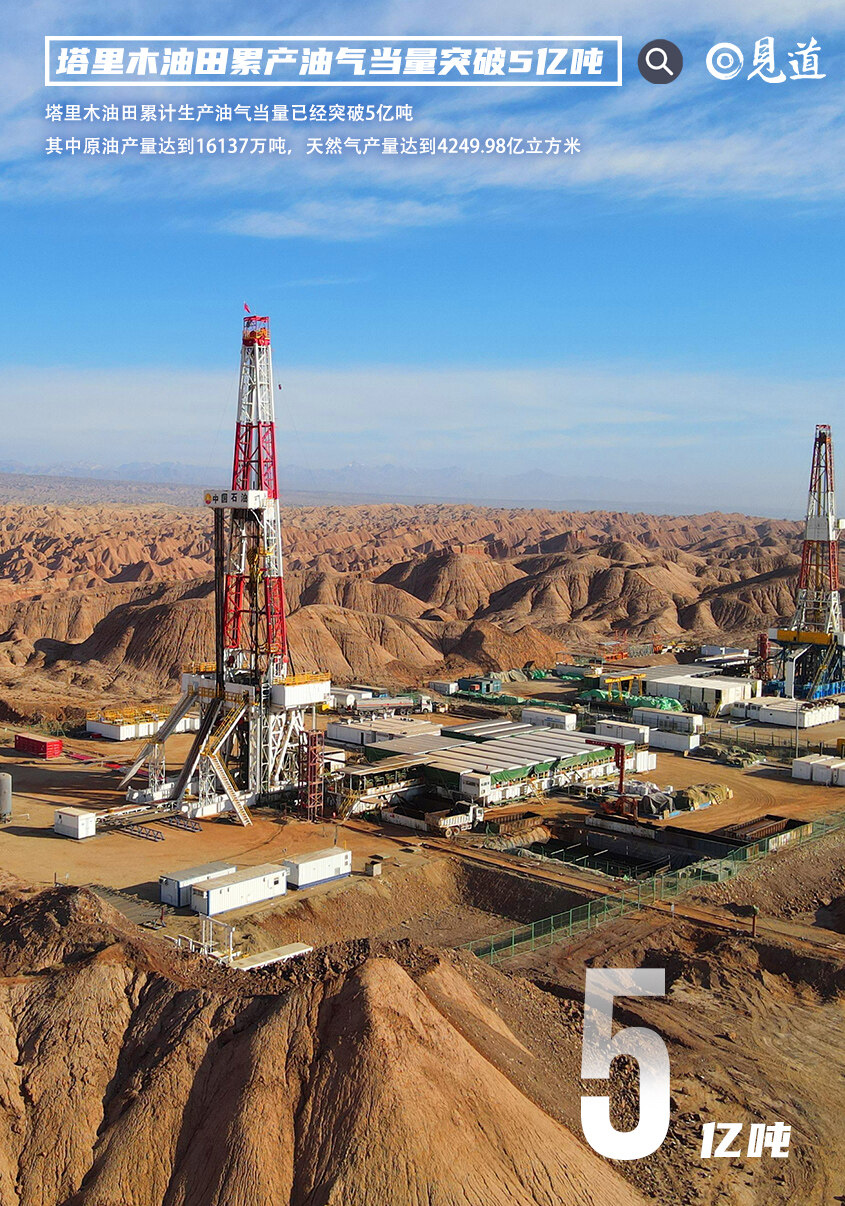 塔里木油田位于中国新疆塔克拉玛干大沙漠中,是中国陆上第三大油气田,也是中国西气东输的主力气源地。该油田的石油和天然气储量非常丰富,累计生产油气当量已经突破5亿吨,其中原油产量达到16137万吨,天然气产量达到4249.98亿立方米。