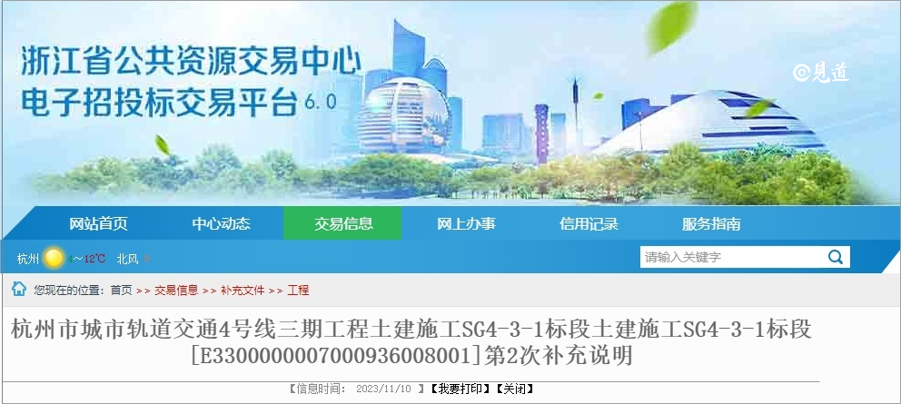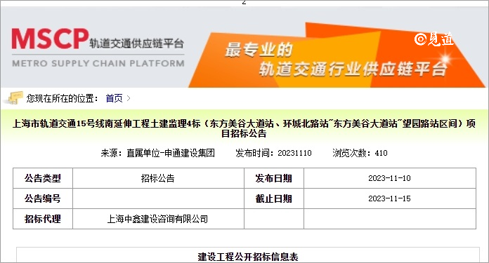 2023年11月10日,深圳市城市轨道交通17号线一期17101标施工总承包工程招标公告、杭州市城市轨道交通4号线三期工程土建施工招标公告、上海市轨道交通15号线南延伸工程土建监理项目招标公告陆续发布,三个项目总投资55.04亿元。