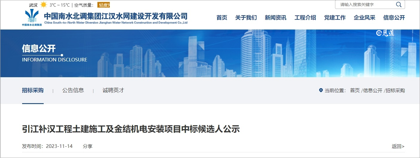 2023年11月14日,见道网记者从中国南水北调集团江汉水网建设开发有限公司了解到,引江补汉工程土建施工及金结机电安装项目中标候选人公示已出炉,具体情况如下: