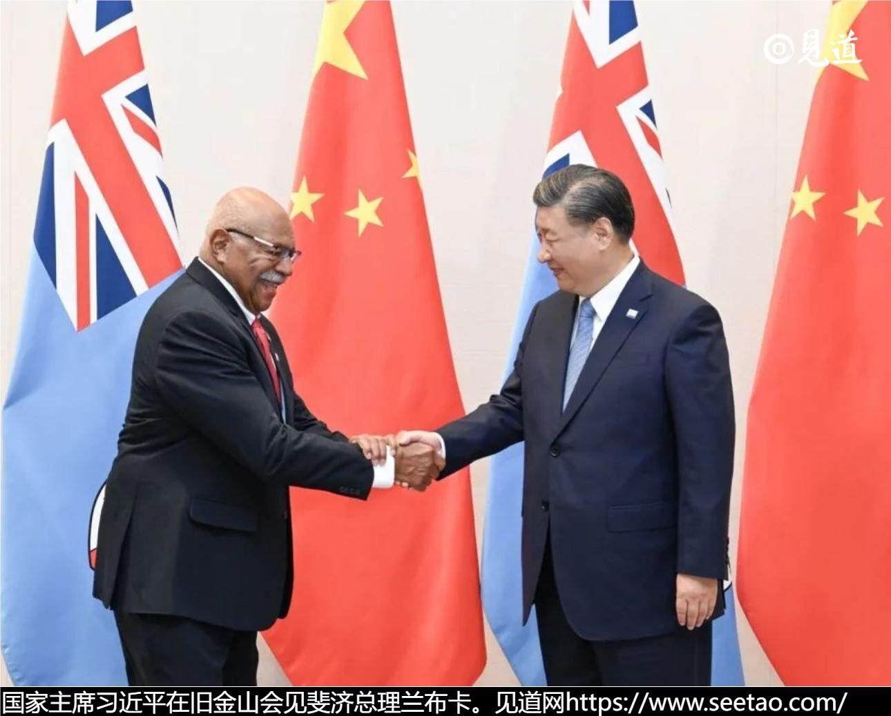 国家主席习近平在旧金山会见斐济总理兰布卡。习近平指出,斐济是最早同新中国建交的太平洋岛国,几天前迎来中斐建交48周年。中方把斐济作为好朋友、好伙伴,支持斐济自主选择发展道路、实现国家发展振兴。中方愿同斐方一道,夯实政治互信,拓展务实合作,深化人文交流,推动中斐全面战略伙伴关系不断发展。一个中国原则是中斐关系健康稳定发展的政治基础,希望斐方在事关中国核心利益和重大关切问题上继续给予中方坚定支持。中方也将一如既往支持斐方维护国家主权、安全和领土完整。中方愿同斐方加强共建“一带一路”合作,落实全球发展倡议,推进基础设施、农林渔业、新能源等领域合作,助力斐济经济社会发展。中方愿扩大进口斐济特色产品,支持中国企业赴斐济投资,鼓励更多游客赴斐济旅游。