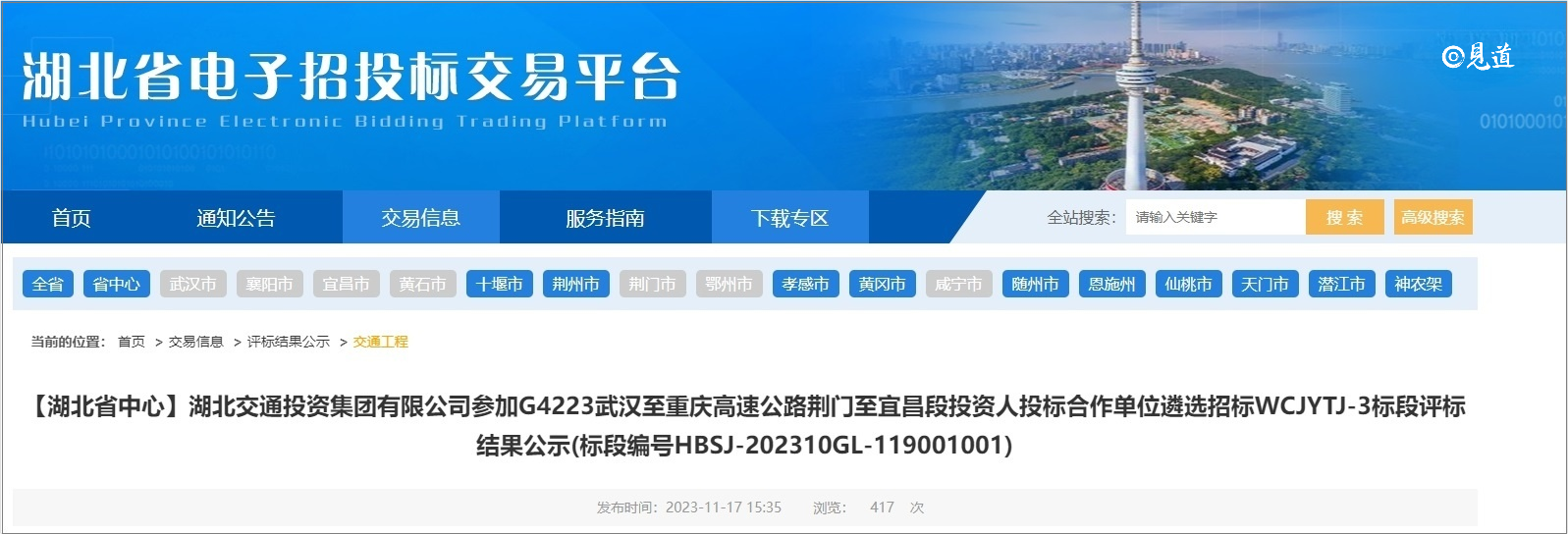 2023年11月17日,湖北省电子招投标交易平台发布了湖北交通投资集团有限公司参加G4223武汉至重庆高速公路荆门至宜昌段投资人投标合作单位遴选招标WCJYTJ-3标段评标结果公示,具体情况如下: