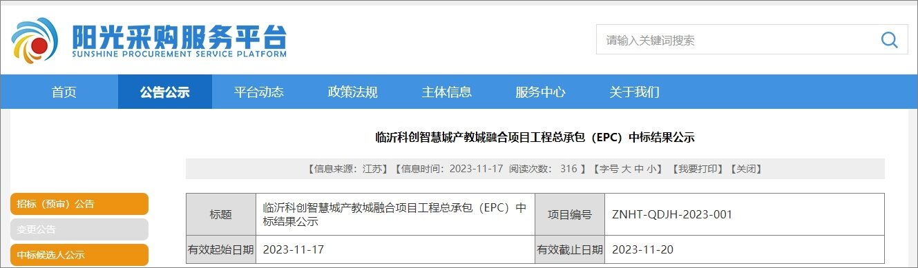 2023年11月17日,见道网记者从阳光采购服务平台了解到,山东临沂科创智慧城产教城融合项目工程总承包中标结果公示已发布,该项目由大地都市国际建筑设计有限公司牵头的联合体中标,项目计划总投资343.4亿元。