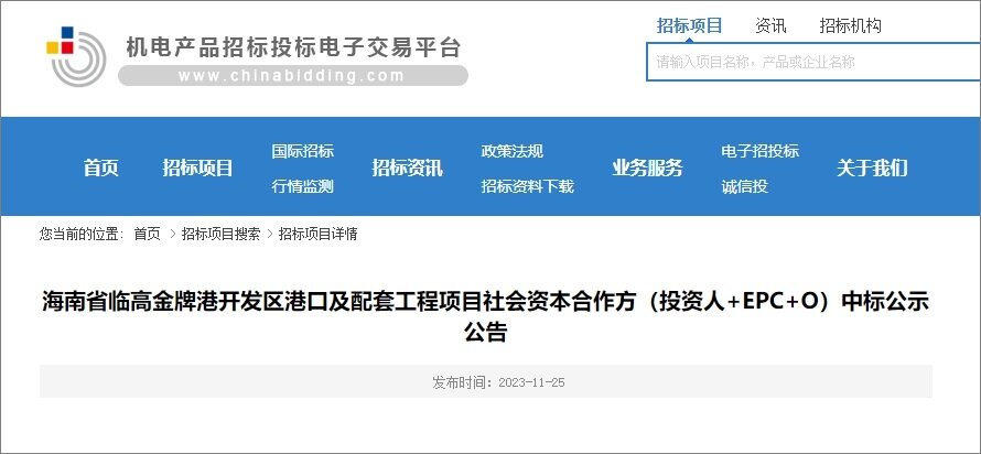 2023年11月25日,见道网记者从机电产品招标投标电子交易平台了解到海南省临高金牌港开发区港口及配套工程项目社会资本合作方中标公示公告已发布,详情如下: