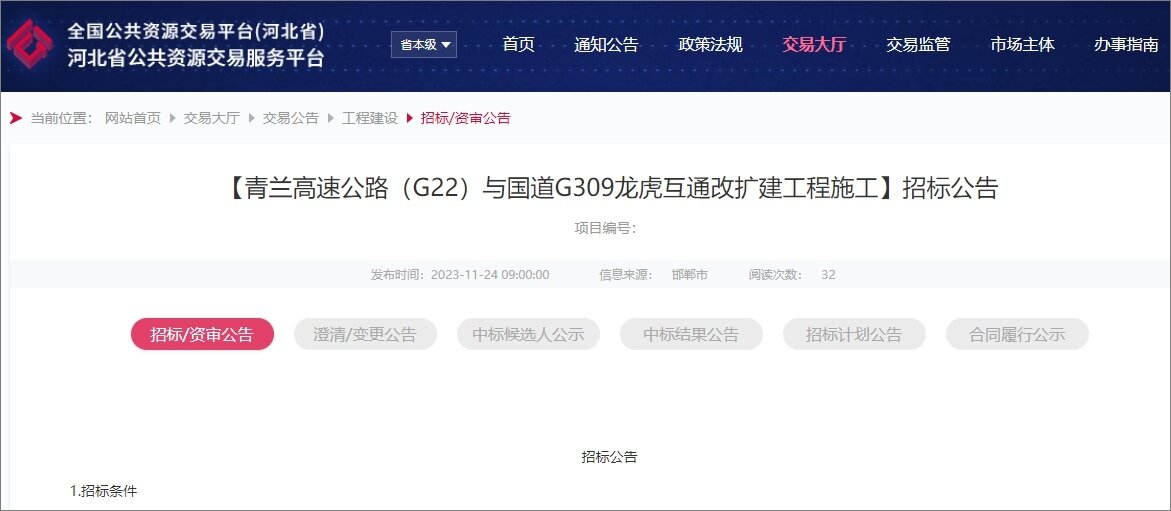 2023年11月24日,见道网记者从河北省公共资源交易中心了解到青兰高速公路(G22)与国道G309龙虎互通改扩建工程施工招标公告已发布,具体情况如下: