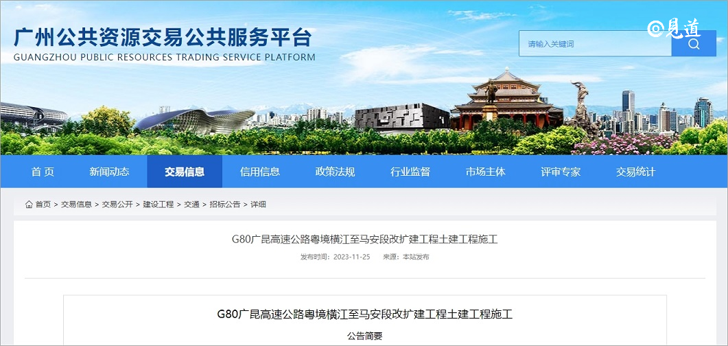 2023年11月25日,广州公共资源网发布了G80广昆高速公路粤境横江至马安段改扩建工程土建工程施工招标公告,该项目所属行业公路,项目总投资估算92.2亿元。