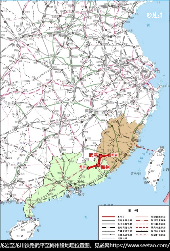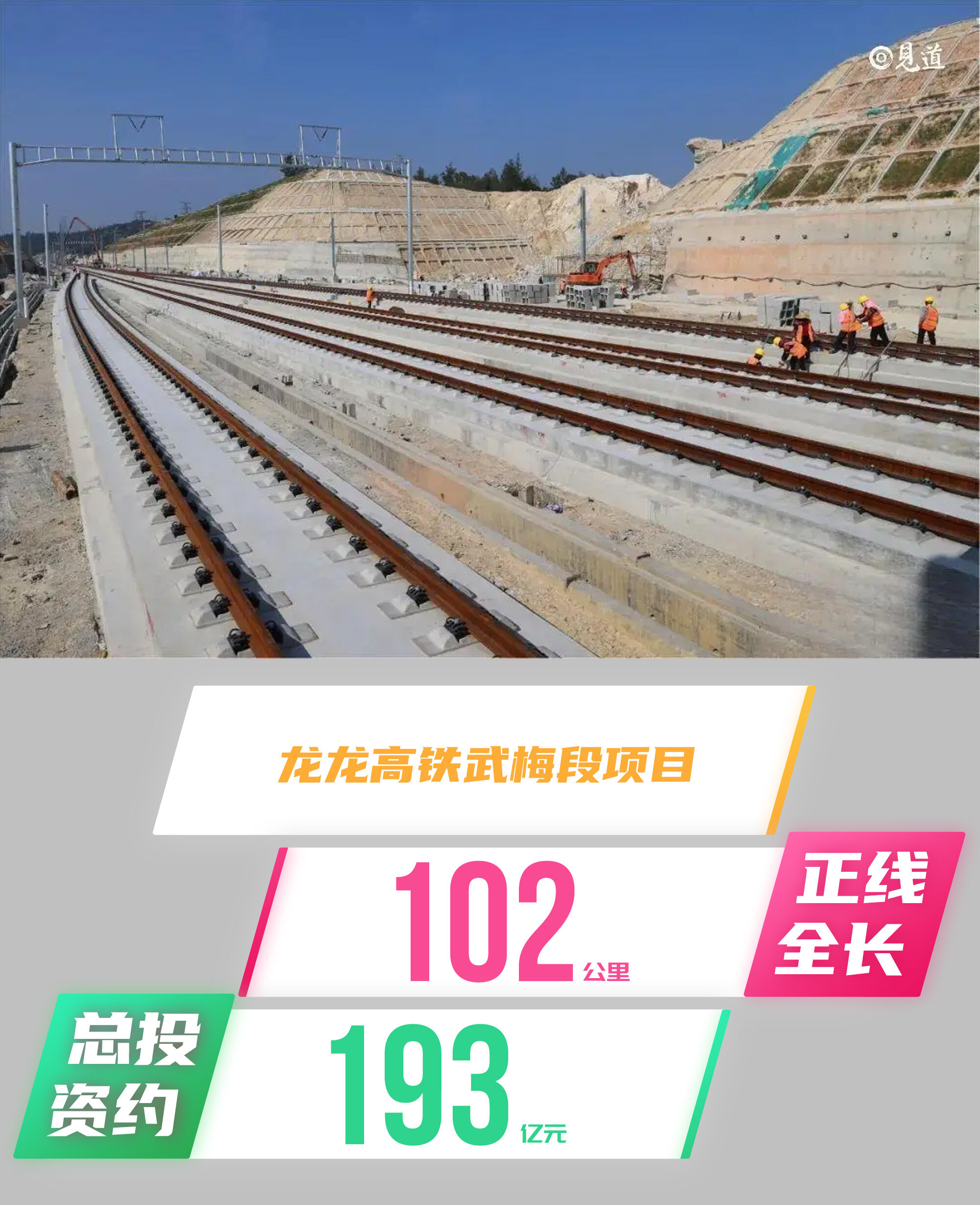 龙龙高铁武梅段项目位于福建省和广东省境内,线路自在建的龙龙高铁武平站引出,经龙岩市武平县、梅州市蕉岭县、梅县区、梅江区,引入梅州西站,与在建的梅州至龙川高铁衔接。新建正线全长约102公里,桥隧比约82.6%,按双线、时速250公里设计建设。总投资约193亿元,由国铁集团和福建省、广东省合作建设。其中,福建段约12.7公里、投资约17.4亿元,福建段全部工程在龙岩境内。根据计划安排,力争2023年底具备开工条件,2028年建成通车。