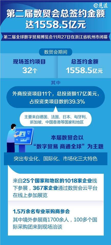 第二届全球数字贸易博览会在浙江省杭州市圆满闭幕。在数贸会期间,共签约了32个项目,总签约金额高达1558.5亿元。其中,外商投资项目共有11个,总投资额为17亿美元,占据投资类项目数的39.3%。这些外商投资项目主要来自德国、法国、日本、匈牙利、新加坡和中国香港等国家和地区。