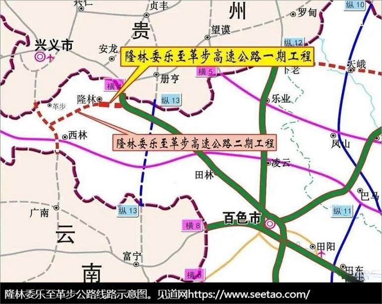 该项目地处广西壮族自治区百色市隆林各族自治县境内。本项目路线总体由东向西布设,沿线穿越隆林县平班镇、新州镇、者浪乡、猪场乡及革步乡所辖区域。项目起于平班镇那他屯附近,顺接隆林委乐至革步公路二期工程主线止点,向西经共和村、大树脚屯、谭右屯、那谷屯、者浪乡、隆王屯、马用村、岭皓屯、羊街村,止于隆林县革步乡卦白屯东侧城,设枢纽立交接兴义至广南高速公路,项目里程全长41.1公里。