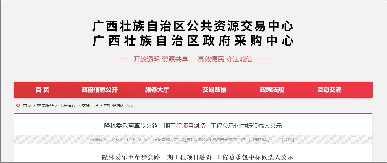 2023年11月28日,广西公共资源交易中心发布了隆林委乐至革步公路二期工程项目融资+工程总承包中标候选人公示,具体情况如下:
