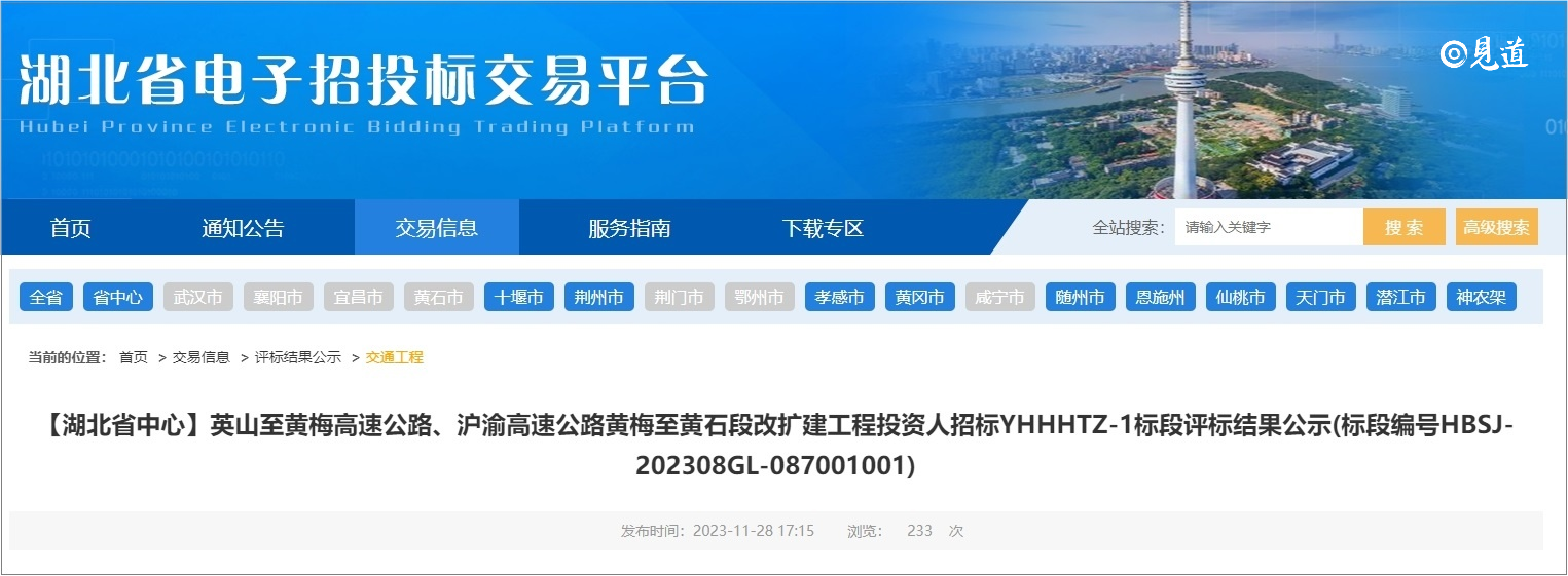 2023年11月28日,湖北省电子招投标交易平台发布了英山至黄梅高速公路、沪渝高速公路黄梅至黄石段改扩建工程投资人招标YHHHTZ-1标段评标结果公示,央企和当地强企联合拿下大单,合同估算价341亿元。