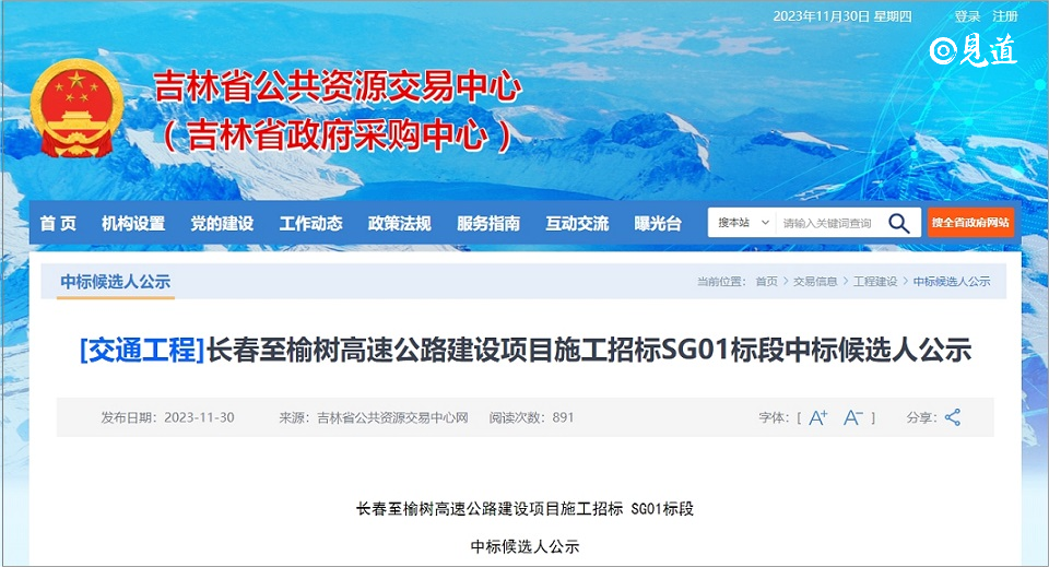 2023年11月30日,见道网记者从吉林省公共资源交易中心获悉,长春至榆树高速公路建设项目中标候选人公示已发布,详情如下: