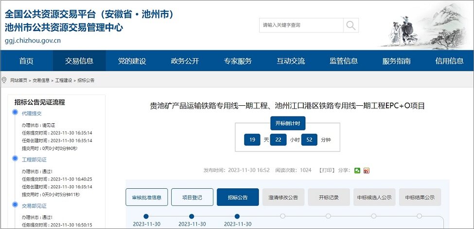 2023年11月30日,池州市公共资源交易网发布了贵池矿产品运输铁路专用线一期工程、池州江口港区铁路专用线一期工程EPC+O项目招标公告,该项目所属行业铁路,项目总投资68.19亿元,计划工期30个月。