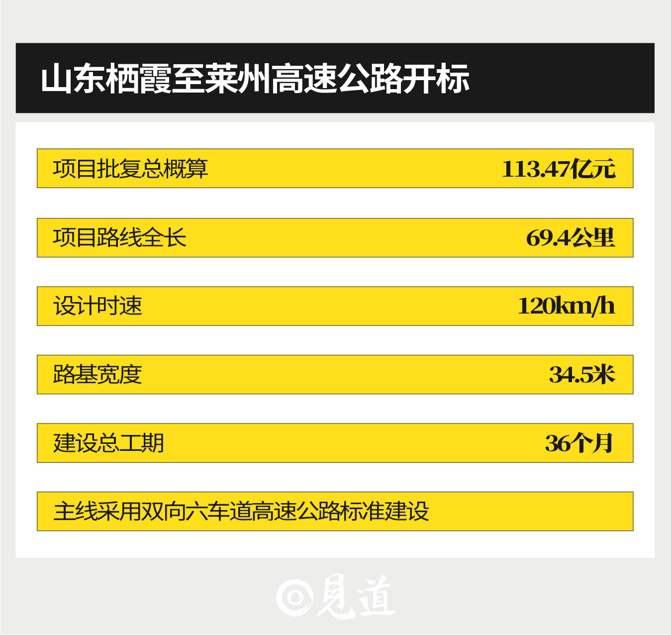 2023年11月30日,山东省公共资源交易中心发布了栖霞至莱州高速公路工程设计施工总承包评标结果公示,该项目批复总概算113.47亿元,建设总工期36个月。