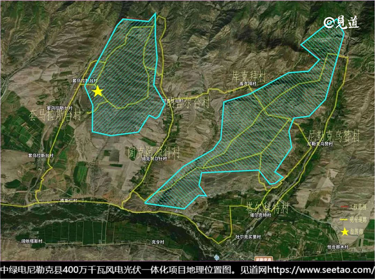 中绿电尼勒克县400万千瓦风电光伏一体化项目320万千瓦光伏项目:项目位于新疆维吾尔自治区伊犁哈萨克自治州尼勒克县,总占地面积15万亩,由一公司承建,合同额108.8亿元,涉及苏布台乡、喀拉苏乡、加哈乌斯拉台乡、尼勒克乌赞乡等4个乡镇区域,建设容量为3200MW固定倾角光伏系统,配套建设5座220kV升压汇集站。