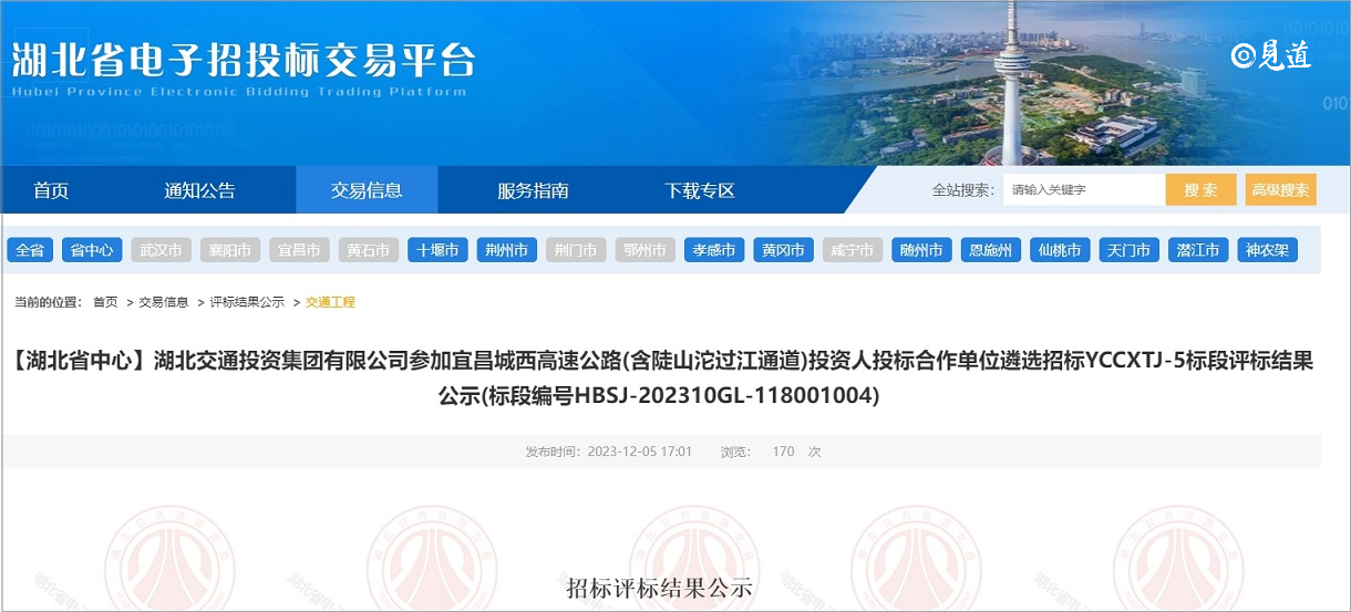 2023年12月5日,湖北省电子招投标交易平台发布了湖北交通投资集团有限公司参加宜昌城西高速公路投资人中标候选人公示,具体情况如下: