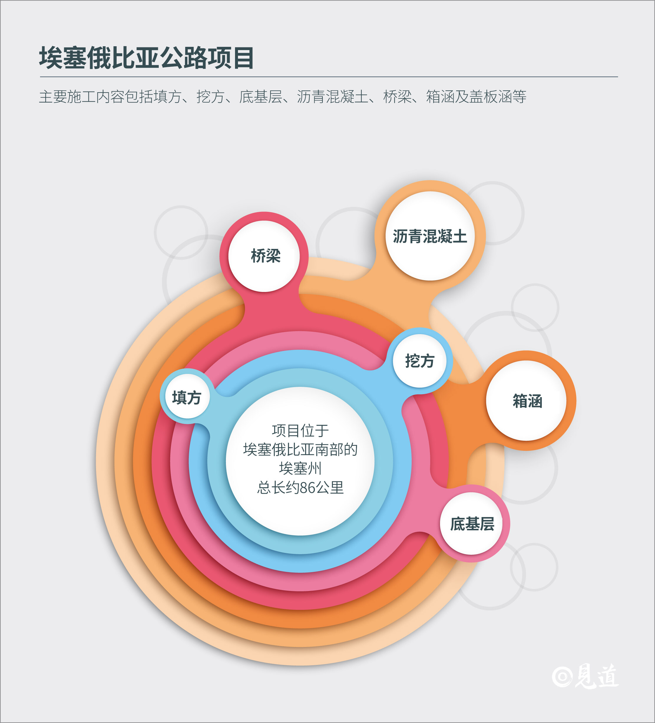 埃塞俄比亚定可—索拉—希夫特公路工程项目,项目位于埃塞俄比亚南部的埃塞州,业主是埃塞俄比亚公路局,资金来源为非洲发展银行。项目总长约86公里,主要施工内容包括填方、挖方、底基层、沥青混凝土、桥梁、箱涵及盖板涵等。