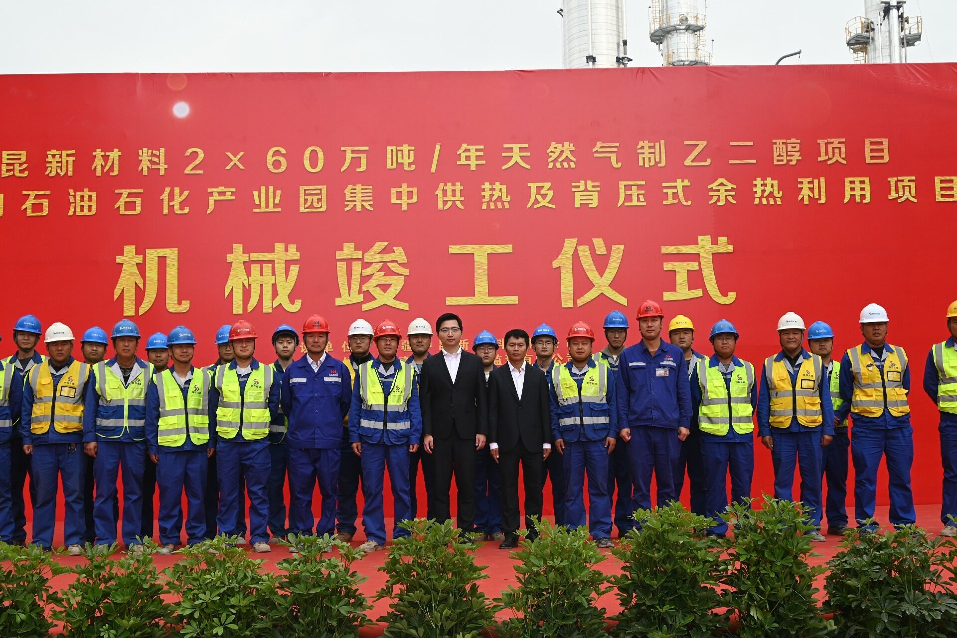 项目自2022年9月23日开工建设以来, 施工管理团队克服重重困难,抢抓时机,精心编制科学有效施工方案,合理安排施工人员,上足人力、物资和机械设备,掀起施工大干热潮,抓质量、赶进度,确保项目按照施工既定目标有序推进。2023年3月18日,全场首台甲醇回收塔首吊成功,2023年9月26日项目实现机械竣工目标,2023年11月29日比原计划提前一个月顺利产出合格的聚酯级乙二醇产品,受到中昆及东华科技的高度认可。