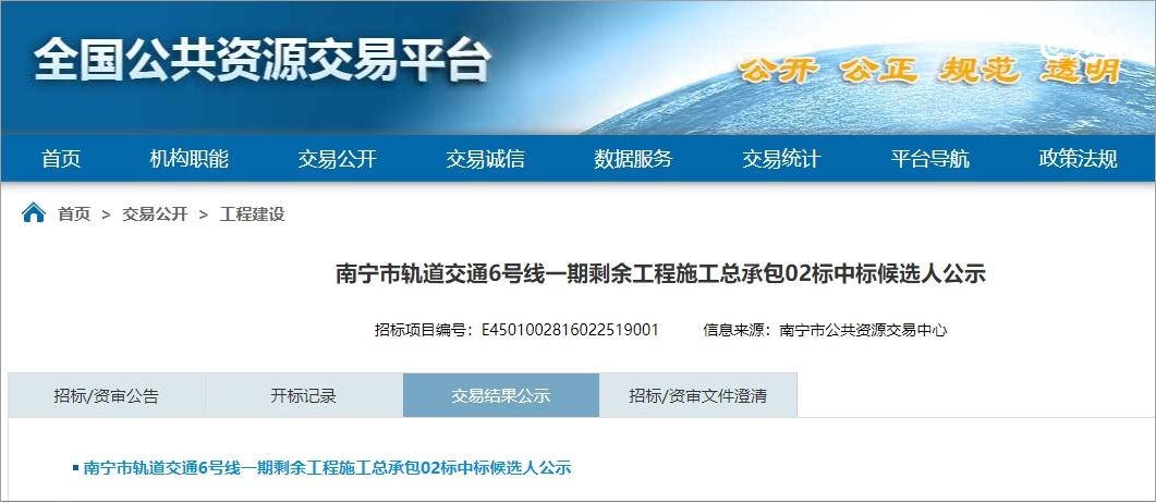 2023年12月9日,全国公共资源交易平台发布了南宁市轨道交通6号线一期剩余工程施工总承包中标候选人公示,本项目共分为2个标段建设,投标总报价约95.2亿元。