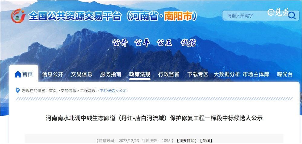 2023年12月13日,全国公共资源交易平台发布了河南南水北调中线生态廊道(丹江-唐白河流域)保护修复工程一标段中标候选人公示,该项目总投资约91.6亿,由中铁十七局牵头的联合中标。