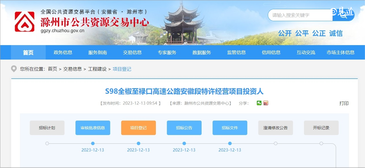 2023年12月13日,安徽省公共资源交易监管网发布了S98全椒至禄口高速公路安徽段特许经营项目投资人招标,该项目所属行业公路,项目总投资49.7亿元。