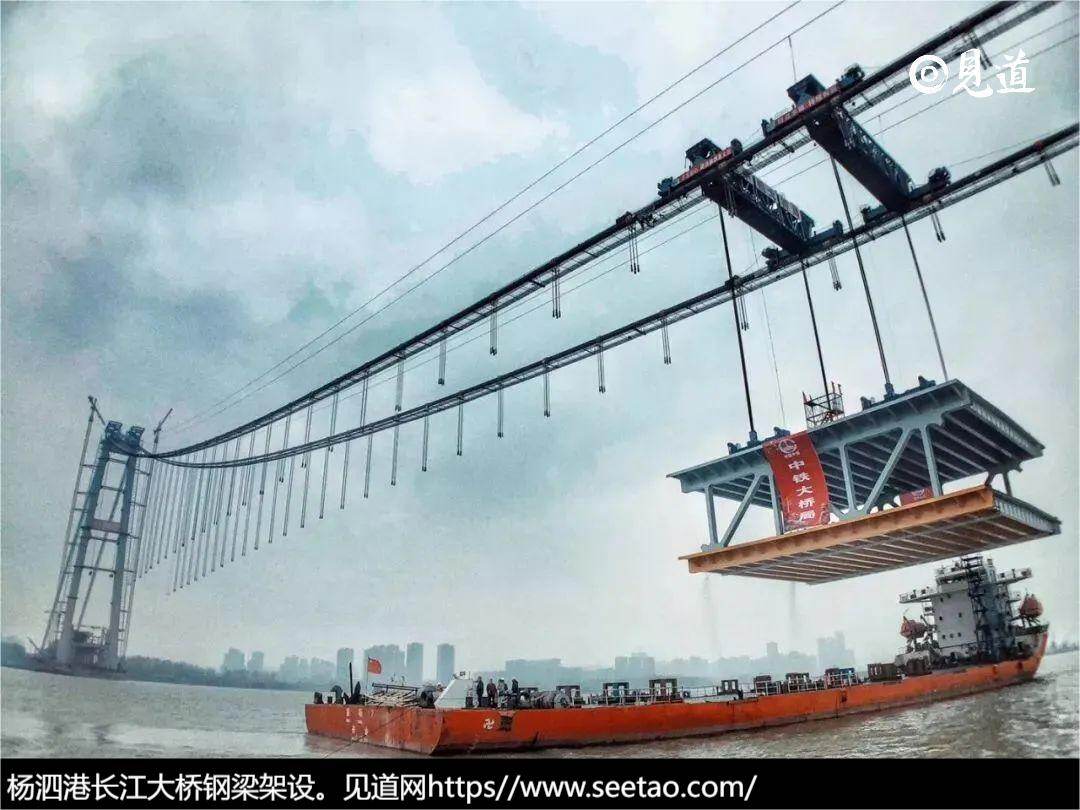 5年后,为了架设主跨1700米的世界最大跨度双层悬索桥——杨泗港长江大桥,中铁大桥局主导研制了4台起重能力为900吨的缆载式架梁吊机。机械化分公司继承和发扬了攻坚克难、敢打硬仗的精神,在钢梁架设上采用了双机联动抬吊技术。他们组建了一支集设备安装、操作、维护于一体的现场作业团队,在近200米高空的猫道上,克服严寒天气,抓进度、保安全,历时36天,完成了全桥49片千吨级钢梁的架设任务,刷新了大跨度悬索桥架梁施工的新纪录。