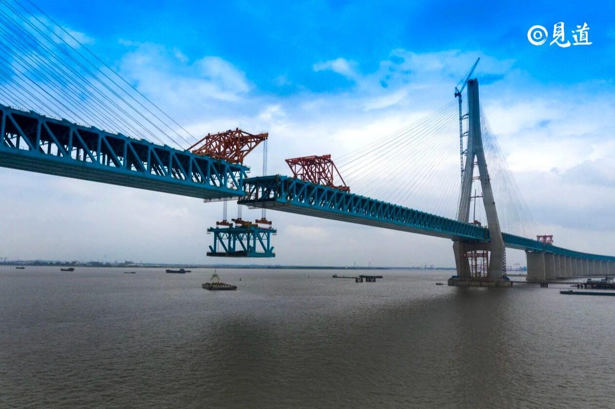 沪苏通长江公铁大桥采用主跨1092米的钢桁梁斜拉桥结构,是世界首座跨度超千米的公铁两用桥。为了进一步探索大吨位整节段钢梁架设的可行性,推动大跨度钢梁的架设进程,中铁大桥局研发了4台1800吨全球最大型的“三吊点”桥面式架梁吊机。为确保钢梁架设的安全、高效,机械化分公司实施了设备全寿命管理模式,严格落实设备研制、运输、安装调试、运营维护、拆除回库重点工序的全面把控。他们积极推广钢梁架设前的桌面推演,优化作业流程,把责任落实到具体环节,构建现代化智能监控系统,实现架梁远程监控可视化。现场作业团队坚守一线400多个日夜,完成了43轮次千吨级钢梁吊装任务,架设钢梁重量累计达10余万吨。