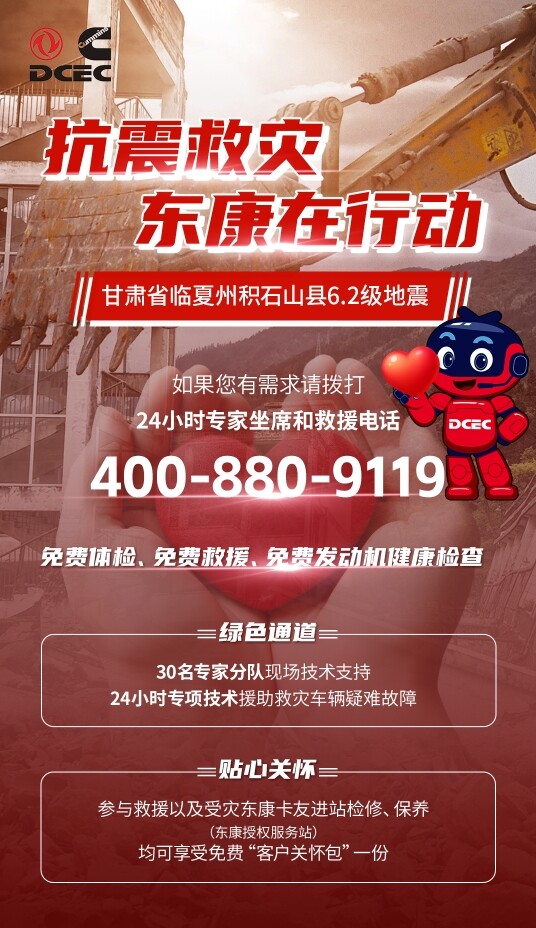 2023年12月18日23时59分甘肃临夏州积石山县发生6.2级地震,灾情发生后,东风康明斯第一时间启动应急救援行动为灾区群众提供暖心服务政策。