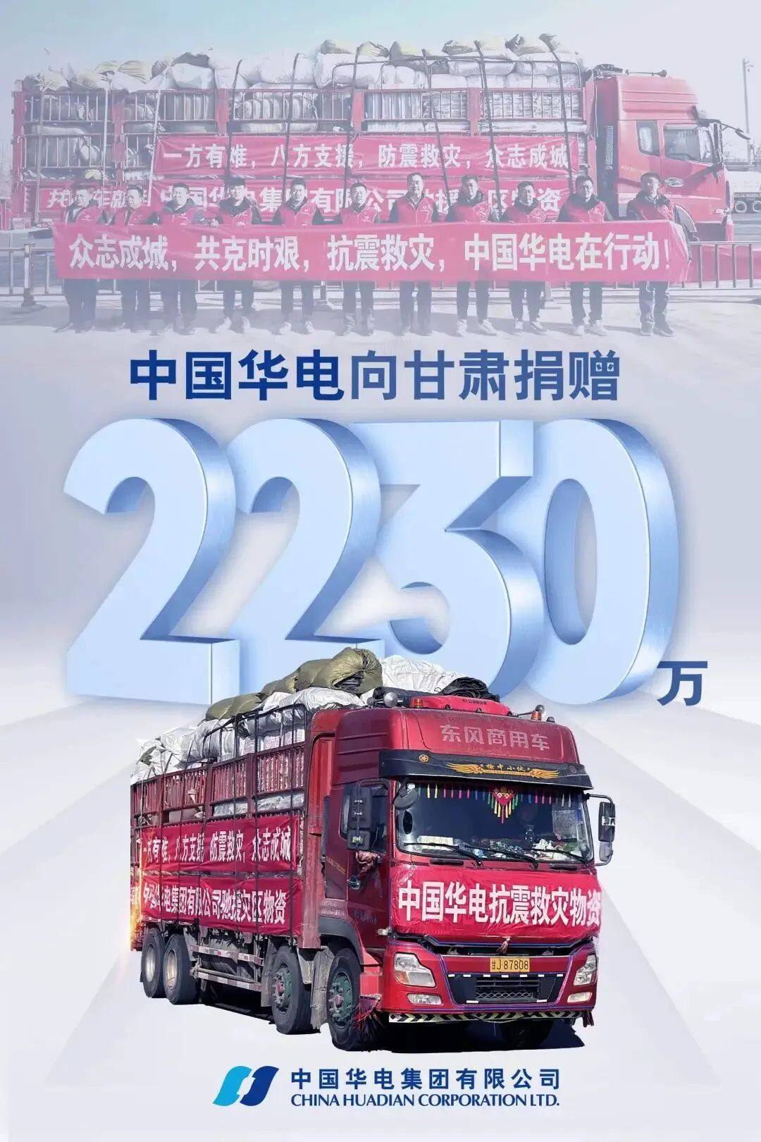 中国华电认真贯彻落实习近平总书记对甘肃临夏州积石山县6.2级地震作出的重要指示精神,心系灾区、迅速响应,第一时间向甘肃省慈善联合总会捐赠2100万元资金,驰援灾区130万元物资,用实际行动践行央企使命担当,为甘肃受灾地区抗震救灾及灾后重建工作贡献华电力量。