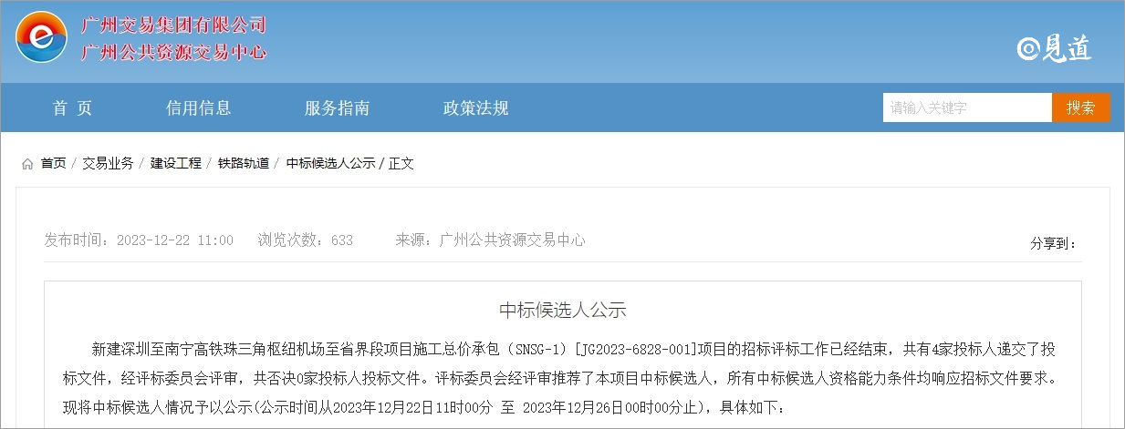 2023年12月22日,广州公共资源交易中心发布了新建深圳至南宁高铁珠三角枢纽机场至省界段项目施工总价承包中标候选人公示,该项目投资估算总额283.36亿元,计划工期48个月。