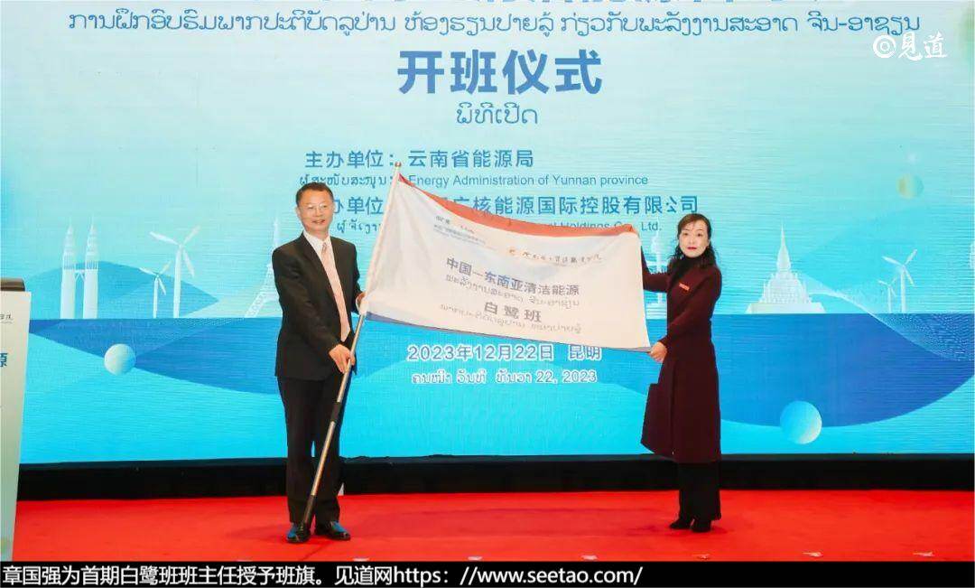在老挝能源矿产部规划合作司副司长孔玛尼·占塔马林、教育体育部办公厅副主任席萨阿·批玛宋等见证下,云南省能源局党组成员、副局长张春红,云南省教育厅党组成员、副厅长赵德荣为“中国—东南亚清洁能源白鹭班”授牌。中国广核集团有限公司党委委员、党委组织部部长、人力资源部总经理、中广核党校常务副校长章国强,中广核能源国际党委书记、董事长时伟奇,中广核能源国际党委副书记、董事、总裁张超群等参加开班仪式。